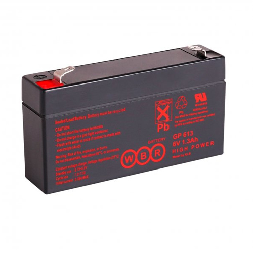 WBR GP 613 (6В, 1,3Ач) - свинцово-кислотная необслуживаемая герметизированная аккумуляторная батарея с предохранительными клапанами. Проста и доступна в обслуживании. Изготовлена с применением технологии AGM (внутренняя рекомбинация газа). Не нуждается в доливе воды, обладают низким саморазрядом