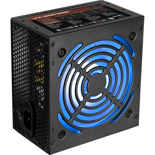 Блок питания, Aerocool, VX-800 PLUS RGB, 800W, ATX, APFC, 20+4 pin, 4+4pin, 6*Sata, 4*Molex, 1*FDD, 2*PCI-E 6+2 pin, Поддержка Haswell, Бесшумный RGB 12-см вентилятор с «умным» управлением скоростью,RGB, кабель питания, Чёрный