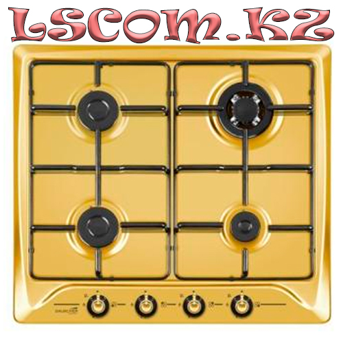 Встраиваемая газовая поверхность, габариты (ШхГ): 60 x 51 см, 4 газовые конфорки (1 конфорка WoK Sabaf), установка: независимая, материал панели: сталь, цвет: золото, материал решеток: чугун, способ подключения: газовая, электроподжиг: автоматический, переключатели: поворотные, расположение панели: спереди, ручки: бронзовые, стиль: ретро.