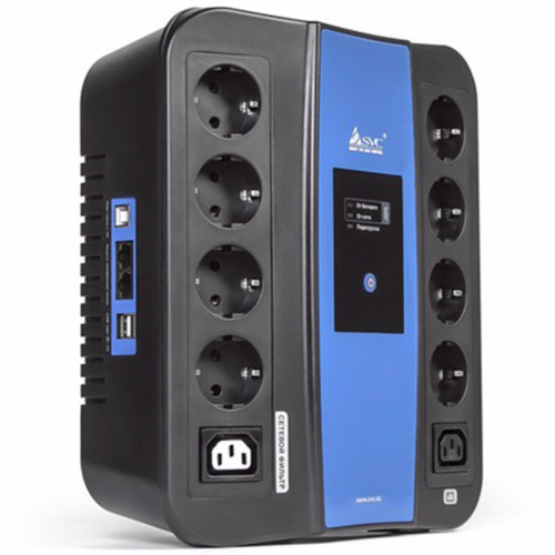 Источник бесперебойного питания, SVC, U-600, USB, Мощность 600ВА/360Вт, Диапазон работы AVR: 165-275В, AVR в режиме Booster: 138-292В, Бат.: 12В/7,5 Ач., 8 вых.: Shuko CEE7(4 с работой от батареи,4 сетевой фильтр), 2 вых.: IEC C13, Защита тел. линии, USB 5В/2А*2 шт., Чёрно-синий