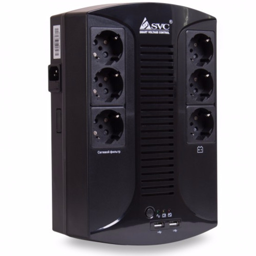 Источник бесперебойного питания, SVC, U-650-L, Smart, USB, Мощность 650ВА/390Вт, Диапазон работы AVR: 145-290В, Бат.: 12В/7 Ач х 1 шт.., 6 вых.: Shuko CEE7(3 с работой от батареи, 3 сетевой фильтр), USB 5В/2А*2 шт., Чёрный