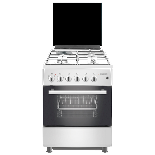 Плита комбинированная, размеры: 85х60х60 см, 3 газовые конфорки, 1 электрическая конфорка, поджиг, электрическая духовка, цвет: стальной, эмалированные решетки, стеклянная крышка.