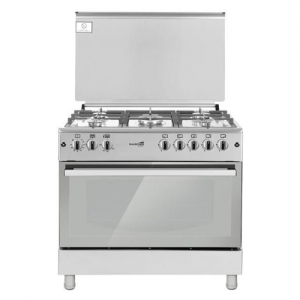 Плита комбинированная, размеры: 85х90х60 см, 5 газовые конфорки, объем духовки: 110 л, электрическая духовка, чугунные решетки, поджиг, подсветка, цвет: стальной, стеклянная крышка, термостат, таймер, стекло дверцы духовки: 2-х слойное.