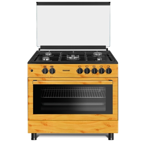Плита газовая, размеры: 85х90х60 см, 5 газовые конфорки, объем духовки: 110 л, газовая духовка, поджиг, подсветка, цвет: дерево, эмалированные решетки, стеклянная крышка, термостат, стекло дверцы духовки: 2-х слойное.