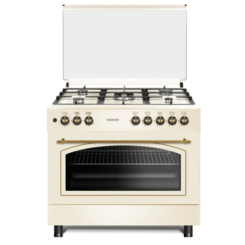 Плита газовая, размеры: 85х90х60 см, 5 газовые конфорки, объем духовки: 110 л, газовая духовка, чугунные решетки, поджиг, подсветка, цвет: бежевый, стиль: ретро, стеклянная крышка, термостат, таймер, стекло дверцы духовки: 2-х слойное.
