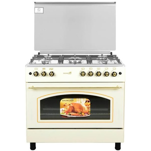 Плита комбинированная, размеры: 85х90х60 см, 5 газовые конфорки, электрическая духовка, объем духовки: 110 л, чугунные решетки, поджиг, подсветка, цвет: бежевый, стиль: ретро, стеклянная крышка, термостат, таймер, стекло дверцы духовки: 2-х слойное.