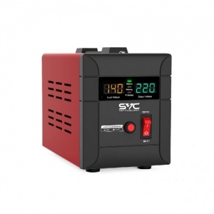 Стабилизатор (AVR), SVC, R-2000, 2000ВА/2000Вт, Диапазон работы AVR: 140-260В, Выходное напряжение: 220В +/-7%, Задержка включения, выход 2 шт Shсuko, LCD-дисплей, Защита: от перегрузки, короткого замыкания, повышенной температуры, Чёрно-красный