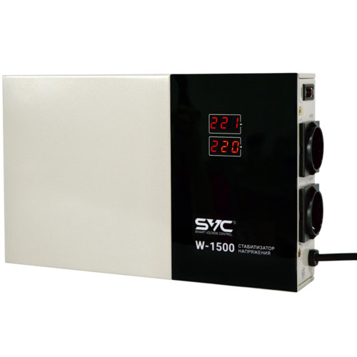 Стабилизатор (AVR), SVC, W-1500, Мощность 1500ВА/1500Вт, LED-дисплей, Диапазон работы AVR: 140-260В, Вых.: 220В+/-7%, 2 х Shcuko, Кабель питания: 1,35м, Габариты: 320*200*65, Черно-белый