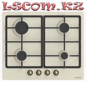 Встраиваемая газовая поверхность, габариты (ШхГ): 60 x 51 см, 4 газовые конфорки, установка: независимая, материал панели: сталь, цвет: бежевый, материал решеток: чугун, способ подключения: газовая, электроподжиг: автоматический, переключатели: поворотные, расположение панели: спереди, газ контроль: есть, ручки: бронзовые, стиль: ретро.