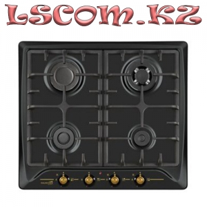 Встраиваемая газовая поверхность, габариты (ШхГ): 60 x 51 см, 4 газовые конфорки (1 конфорка WoK Sabaf), установка: независимая, материал панели: сталь, цвет: черный, материал решеток: чугун, способ подключения: газовая, электроподжиг: автоматический, переключатели: поворотные, расположение панели: спереди, ручки: бронзовые, стиль: ретро.