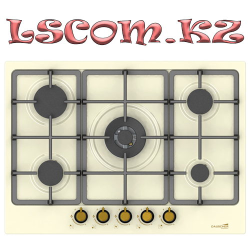 Встраиваемая газовая поверхность, габариты (ШхГ): 70 x 51 см, 5 газовые конфорки (1 конфорка WoK Sabaf), установка: независимая, материал панели: сталь, цвет: бежевый, материал решеток: чугун, способ подключения: газовая, электроподжиг: автоматический, переключатели: поворотные, расположение панели: спереди, газ контроль: есть, ручки: бронзовые, стиль: ретро.