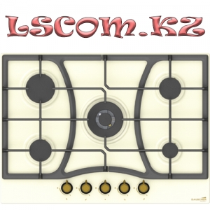 Встраиваемая газовая поверхность, габариты (ШхГ): 70 x 51 см, 5 газовые конфорки (1 конфорка WoK Sabaf), установка: независимая, материал панели: сталь, цвет: бежевый, материал решеток: чугун, способ подключения: газовая, электроподжиг: автоматический, переключатели: поворотные, расположение панели: спереди, газ контроль: есть, ручки: бронзовые, стиль: ретро.