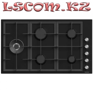 Встраиваемая газовая поверхность, габариты (ШхГ): 90 x 51 см, 5 газовые конфорки (1 конфорка WoK Sabaf), установка: независимая, материал панели: сталь, цвет: черный, материал решеток: чугун, способ подключения: газовая, электроподжиг: автоматический, переключатели: поворотные, расположение панели: спереди, газ контроль: есть.
